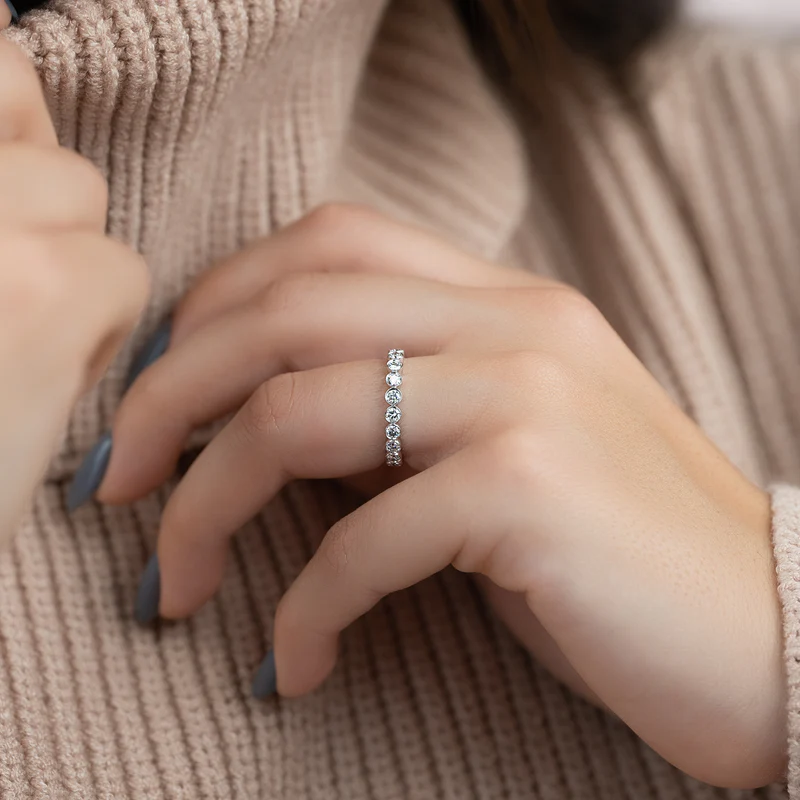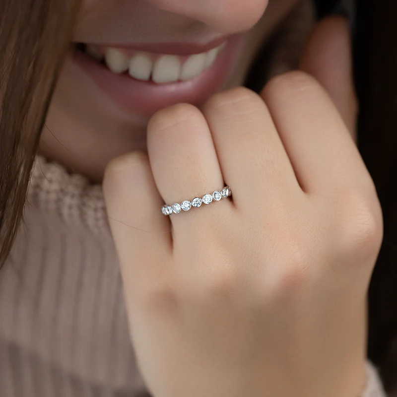 Introducing the timeless and luxurious Round Bezel Eternity. The bezel setting and round cut diamonds are a fiery and opulent combination guaranteed to deliver maximum sparkle and brilliance. Whether as an anniversary or wedding band, this eternity ring will take your breath away with its timeless beauty and undeniable glamor. Treat yourself or someone special to the ultimate symbol of love and luxury with the Round Bezel Eternity.