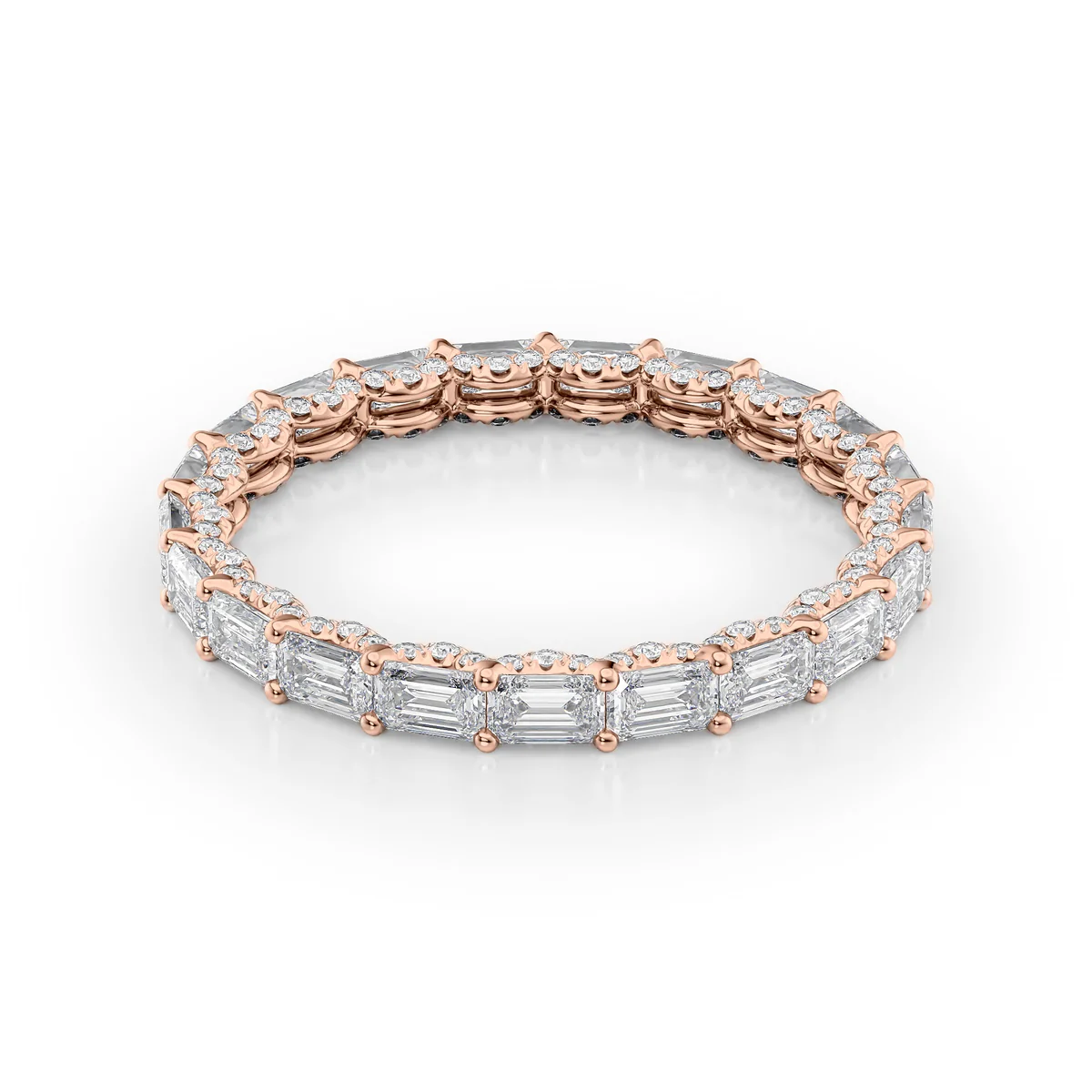 Discover the allure of sophistication with the East West Emerald U Pave Prong Eternity Ring. This piece features emerald-cut diamonds, artistically set in an east-west orientation and impeccably secured by pave U prongs. Each diamond is chosen for its clarity and brilliance, ensuring that the ring sparkles under the light and draws attention to the hand. Perfect for those who appreciate the beauty of timeless design and the luxury of exquisite craftsmanship.