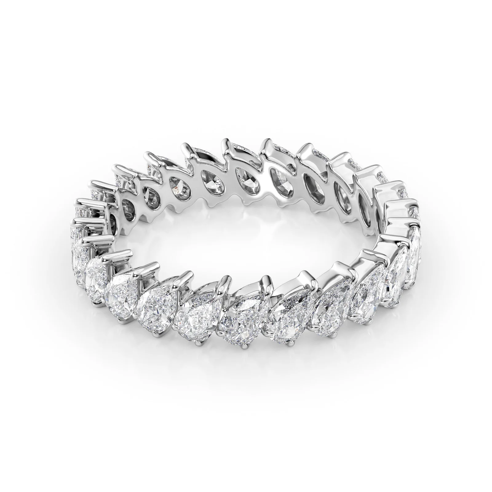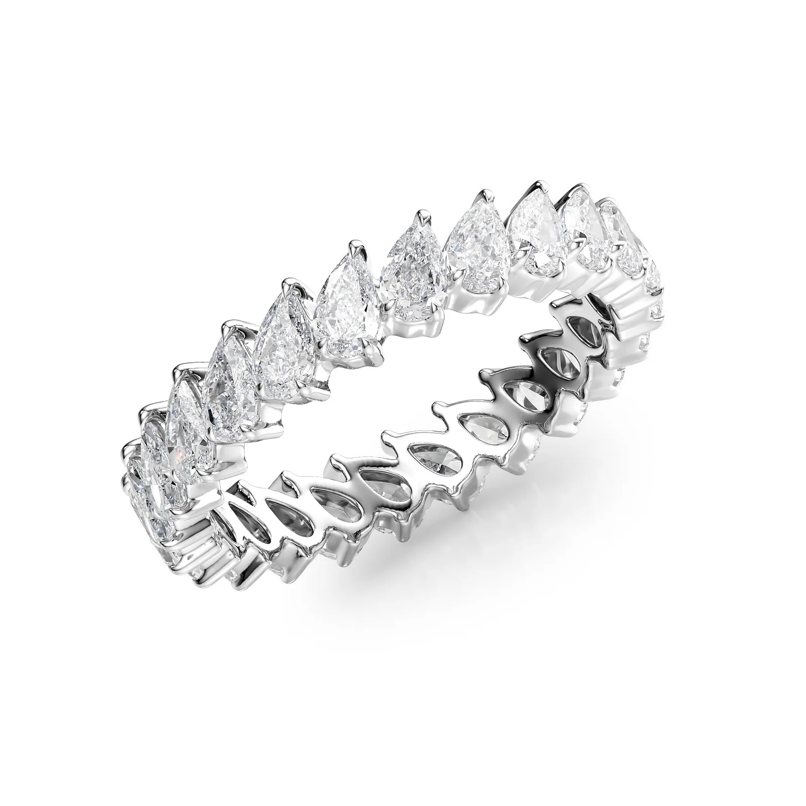 The Slanted Pear Eternity Ring dazzles with its innovative design, featuring alternating pear-cut diamonds set in a unique slanted arrangement. This ring combines the timeless beauty of pear-cut diamonds with a modern twist, creating a piece that is both elegant and eye-catching. Perfect for those who seek a distinctive symbol of eternal love, its slanted setting enhances each diamond’s brilliance, making it a standout choice for any occasion.
