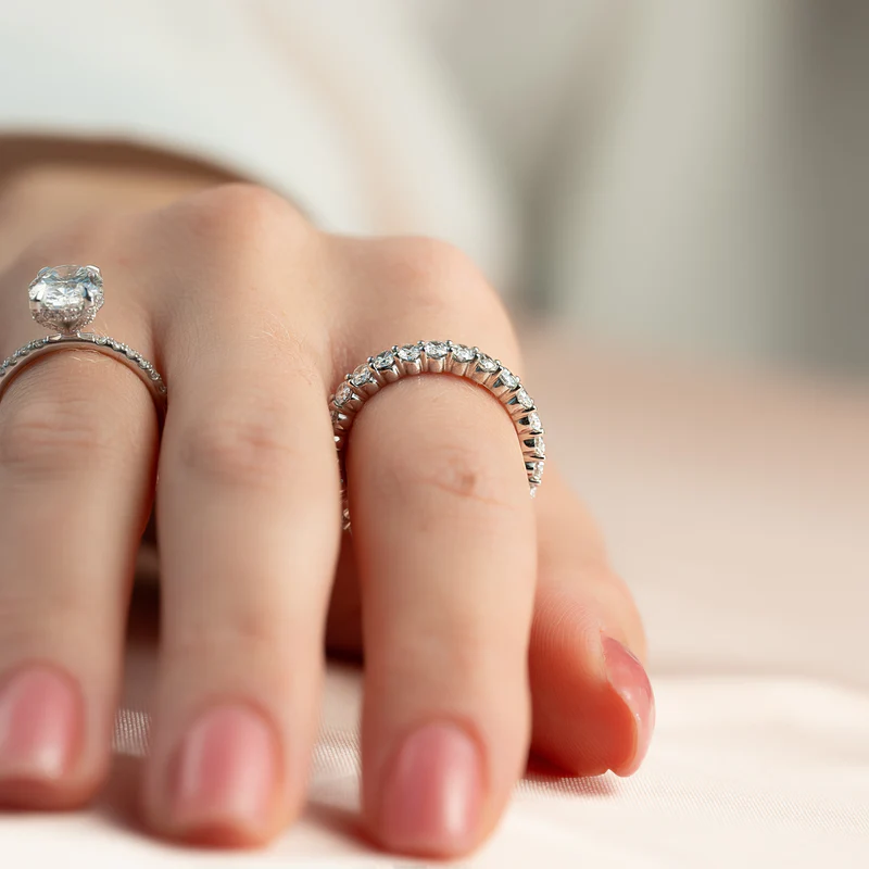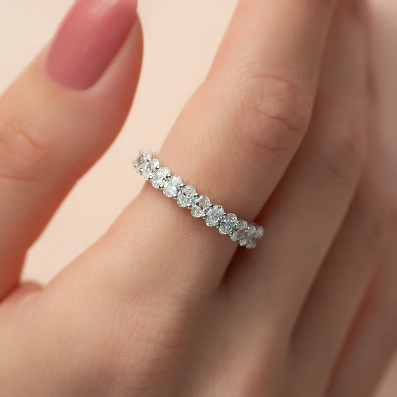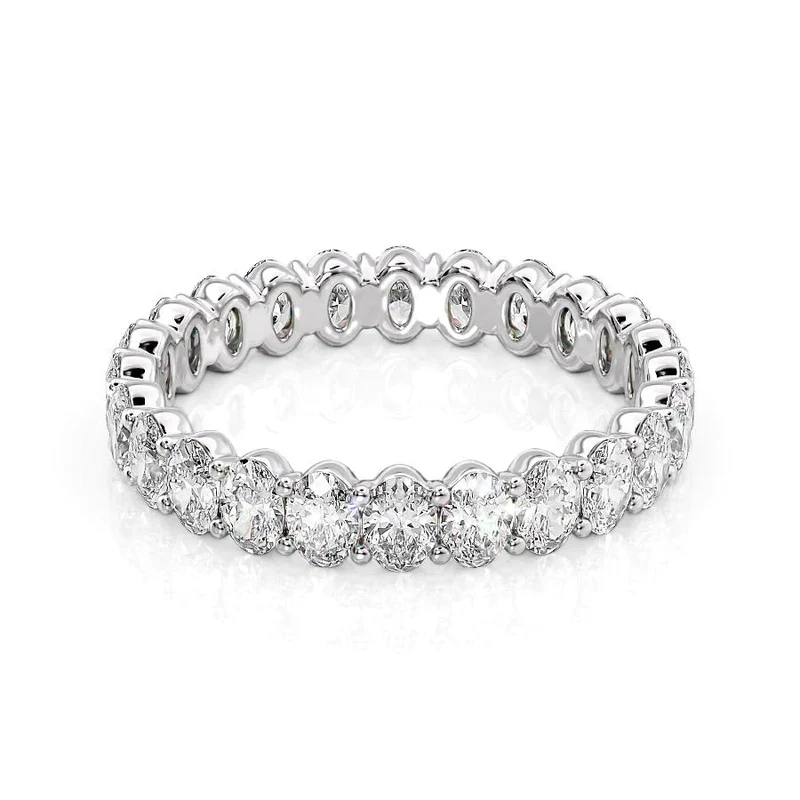 The Oval Eternity Ring is a true symbol of beauty and elegance. It features oval lab diamonds perfectly set in a shared prong setting, creating an unbroken string of light that captures every gaze. The exceptional brilliance of the diamonds illuminates the entire band, making it a mesmerizing sight to behold. Treat yourself or a loved one to the radiance of the Oval Eternity Ring and experience the captivating beauty it brings to any occasion.