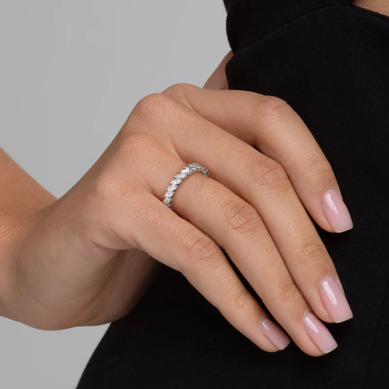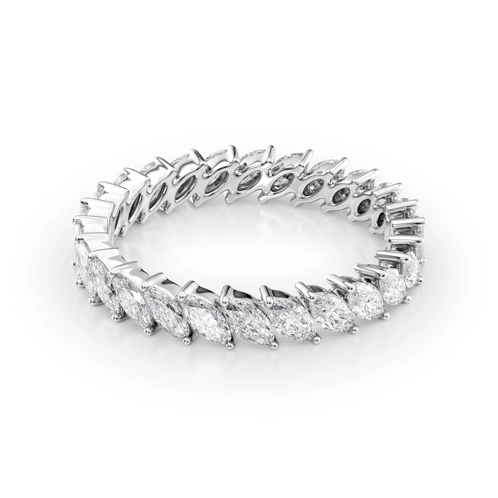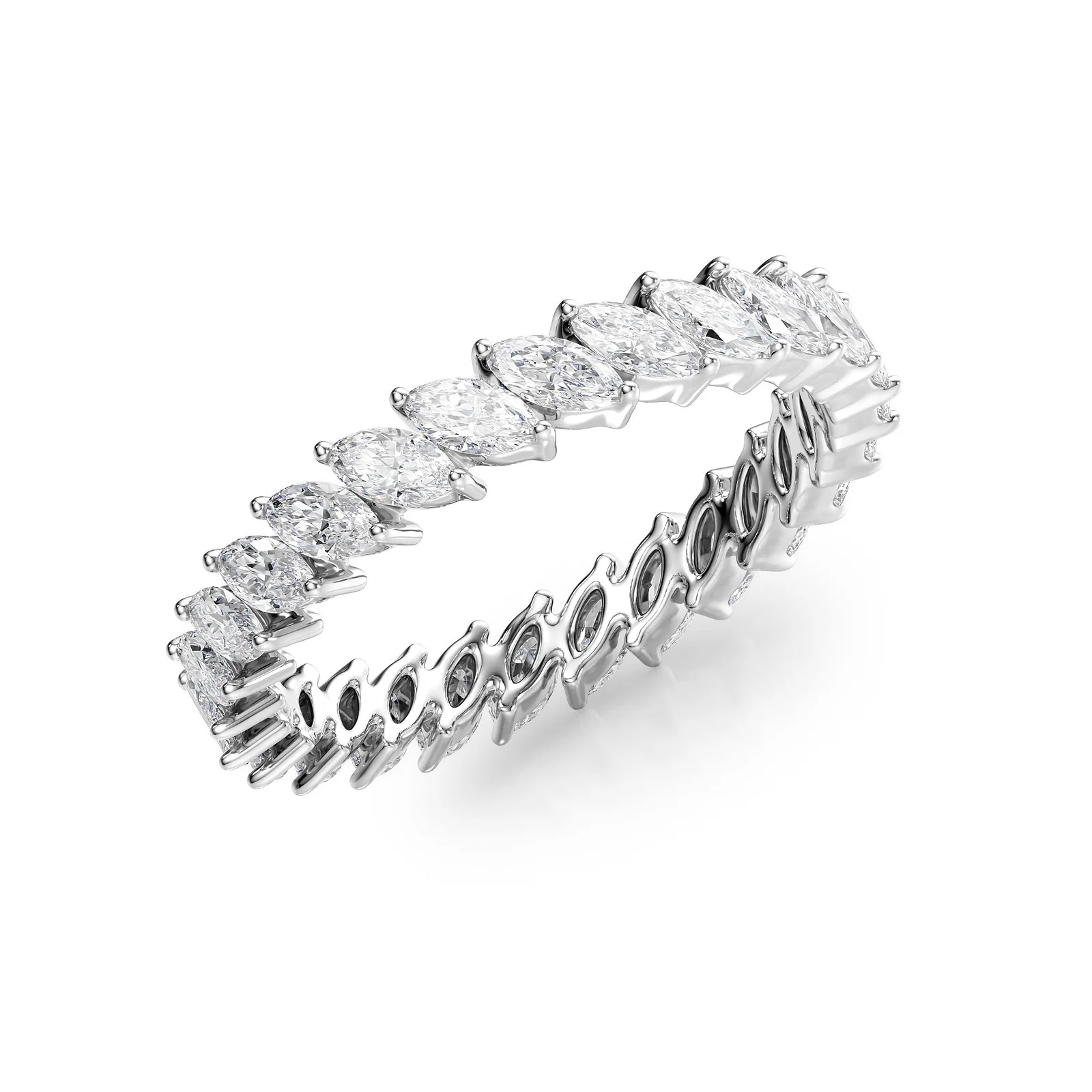 The Slanted Marquise Eternity Ring dazzles with its innovative design, featuring alternating marquise-cut diamonds set in a unique slanted arrangement. This ring combines the timeless beauty of the marquise cut with a modern twist, creating a piece that is both elegant and eye-catching. Perfect for those who seek a distinctive symbol of eternal love, its slanted setting enhances each diamond’s brilliance, making it a standout choice for any occasion.