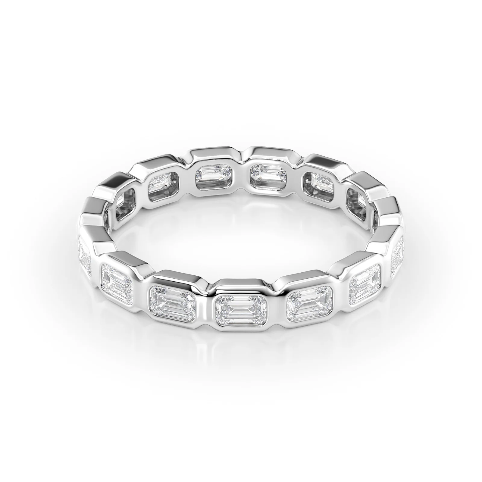 Step into the limelight with the East West Emerald Bezel Eternity Ring. This ring features breathtaking emerald-cut diamonds, each set in an east-west orientation that exudes modern elegance and a bold aesthetic. The bezel setting not only secures these magnificent gems but also highlights their clean lines and dramatic clarity, making each diamond pop with an icy brilliance.