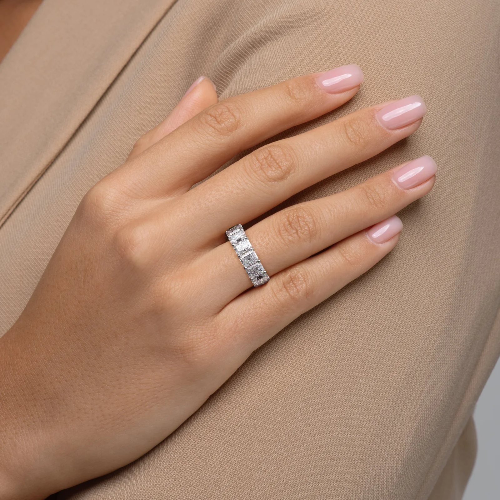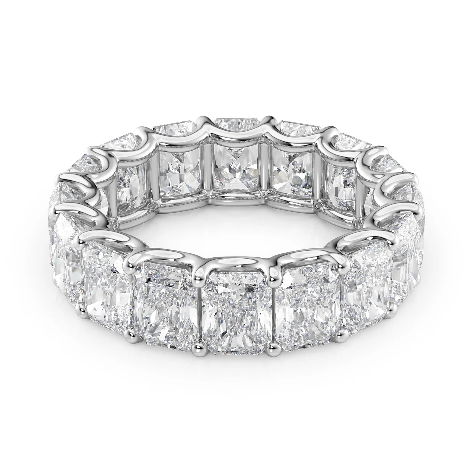 The Radiant U Prong Eternity Ring dazzles with its array of exquisite radiant-cut diamonds, each meticulously set in U prongs to maximize their brilliance and visual impact. This ring embodies eternal elegance, making it an ideal symbol of everlasting love and commitment. Its design ensures that each diamond sparkles to its fullest, creating a seamless band of light around the finger.
