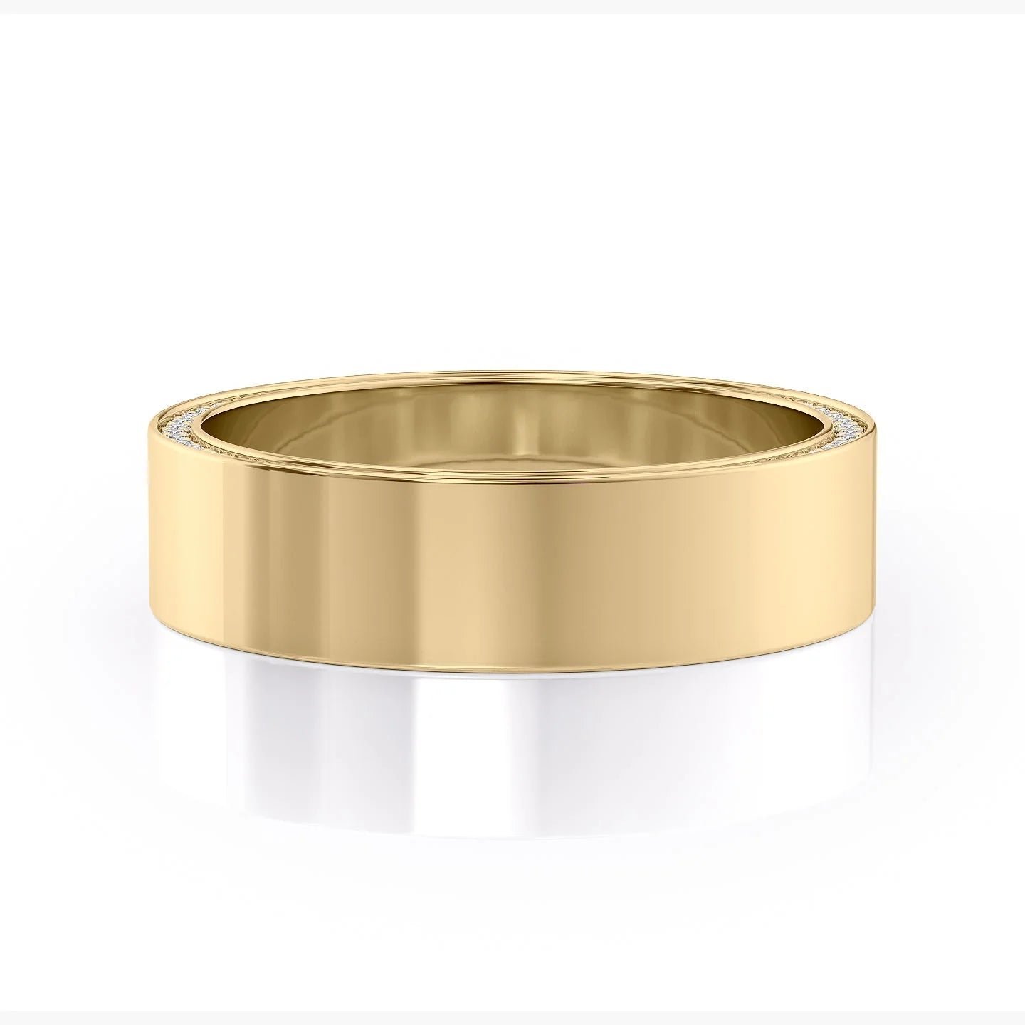 The Andrew features an incredibly modern design with a smooth, streamlined silhouette. Its minimalist exterior gives way to a channel of pave set diamonds glimmering along its inner edges. The high polished and matte finishes provide a sleek, sturdy feel, while the hammered finish adds an element of texture and movement. The band gives a firm and everlasting vibe, with a touch of resilient diamond shine.