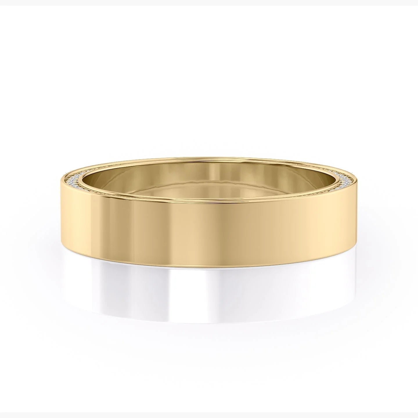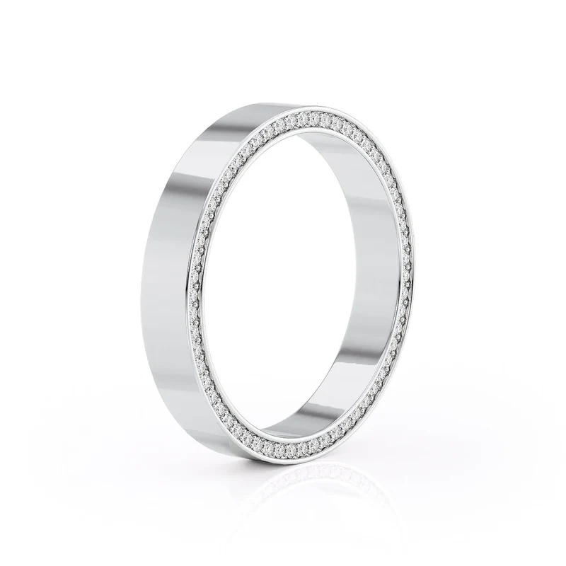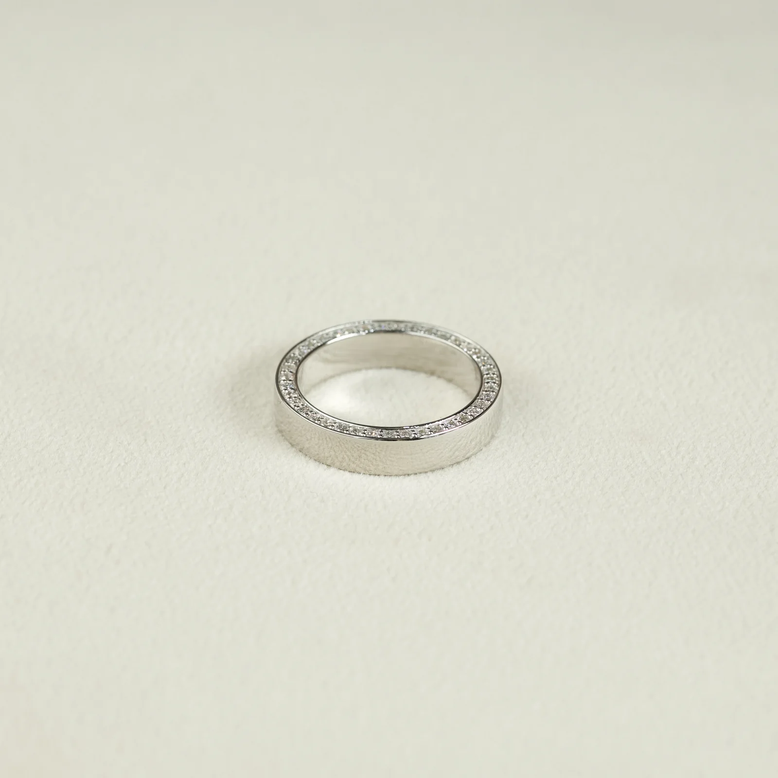 The Andrew features an incredibly modern design with a smooth, streamlined silhouette. Its minimalist exterior gives way to a channel of pave set diamonds glimmering along its inner edges. The high polished and matte finishes provide a sleek, sturdy feel, while the hammered finish adds an element of texture and movement. The band gives a firm and everlasting vibe, with a touch of resilient diamond shine.