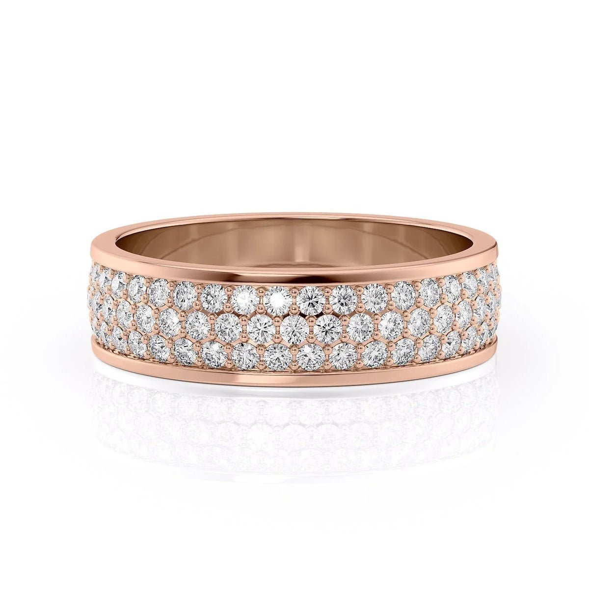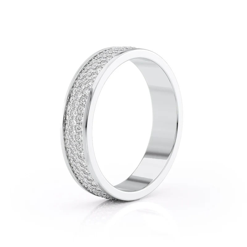A boldly modern silhouette, The Anthony features sleek lines and stunning movement as rows on rows of round brilliant diamonds create striking sparkle. Delicate beaded prongs hold each diamond firmly in place, blending seamlessly into the background and allowing each diamond maximum shine. The piece exudes luxury with an air of effortless opulence, its polish giving a clean finish ensuring smooth, easy wear.