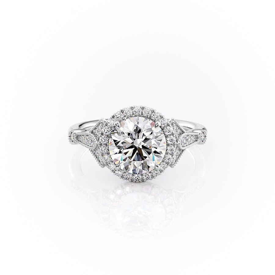 The Halo Stephanie Set With A 5.0 Carat Round 14K White Gold Moissanite